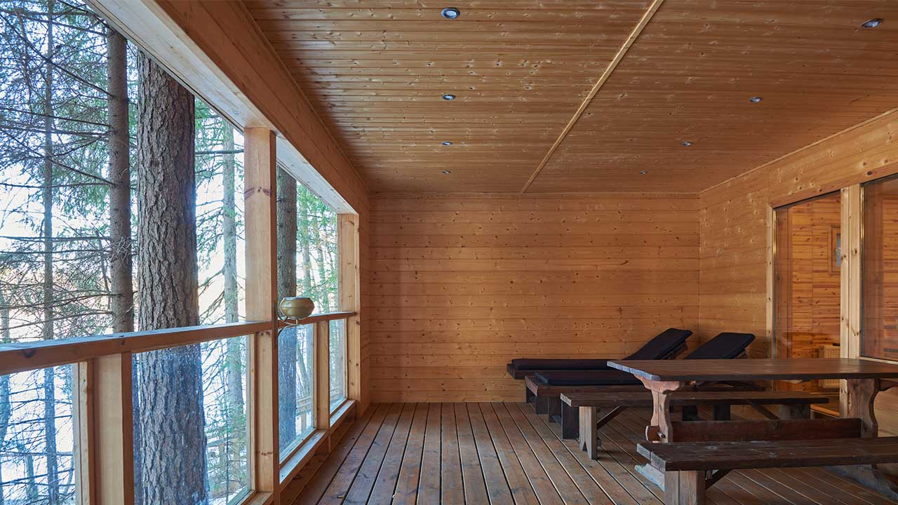 - Парилка на дровах с удобной лежанкой для парения вениками и соляной стенкой