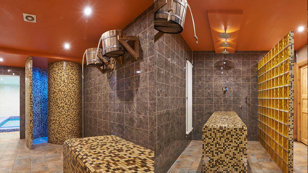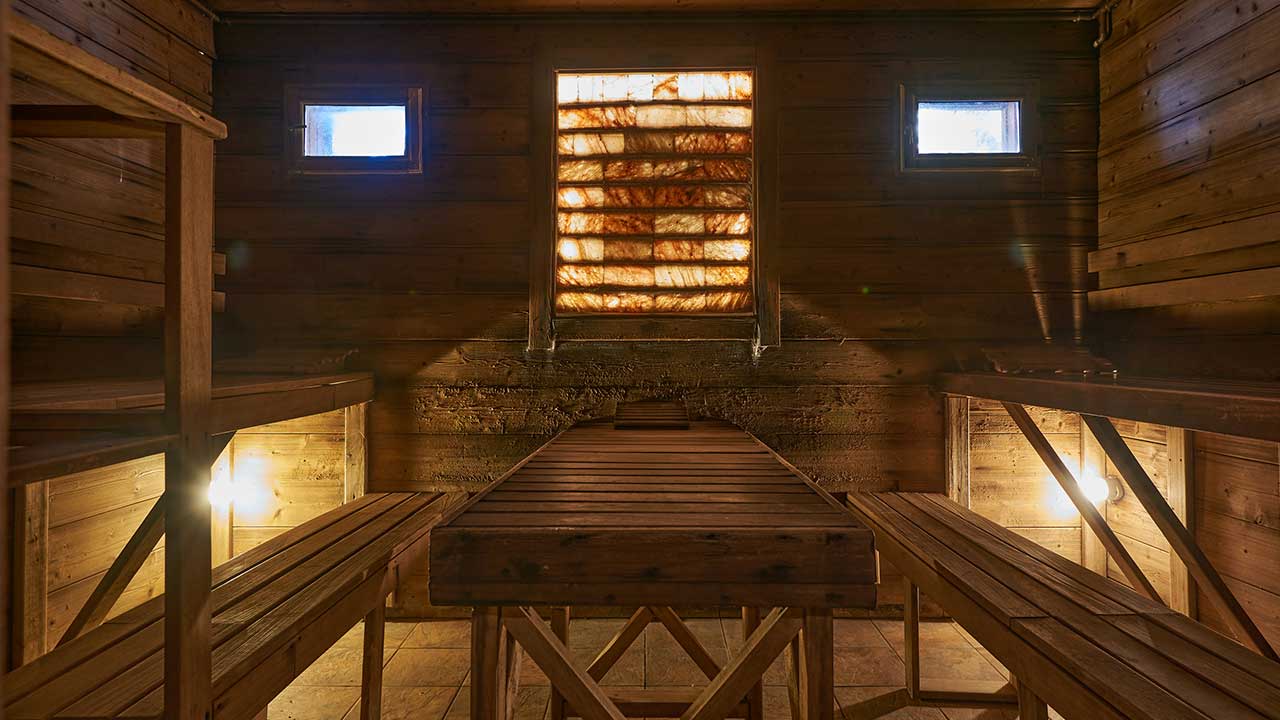 - Парилка на дровах с удобной лежанкой для парения вениками и соляной стенкой