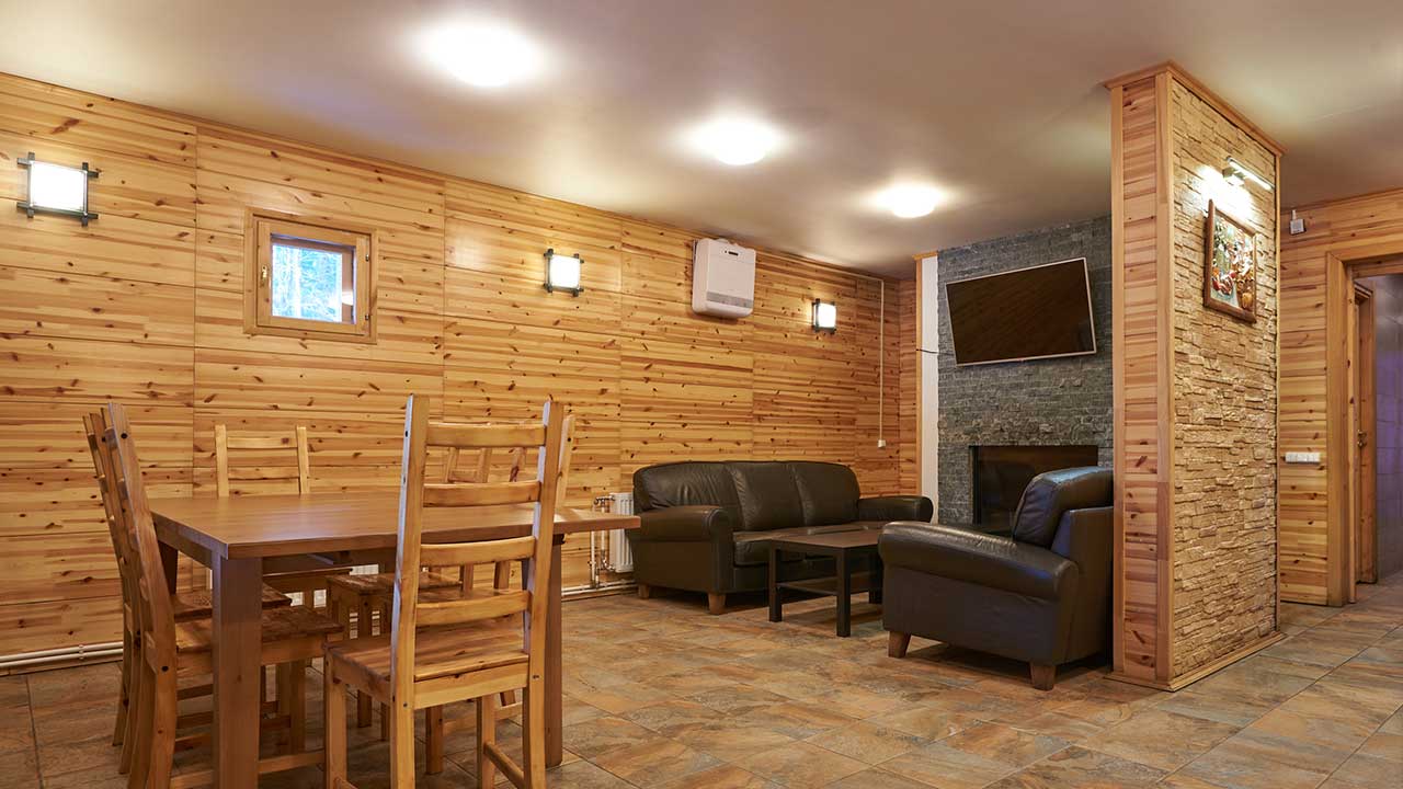 - Просторная комната отдыха с камином, диванами, телевизором, кухонным уголком с набором посуды и обеденным столом.